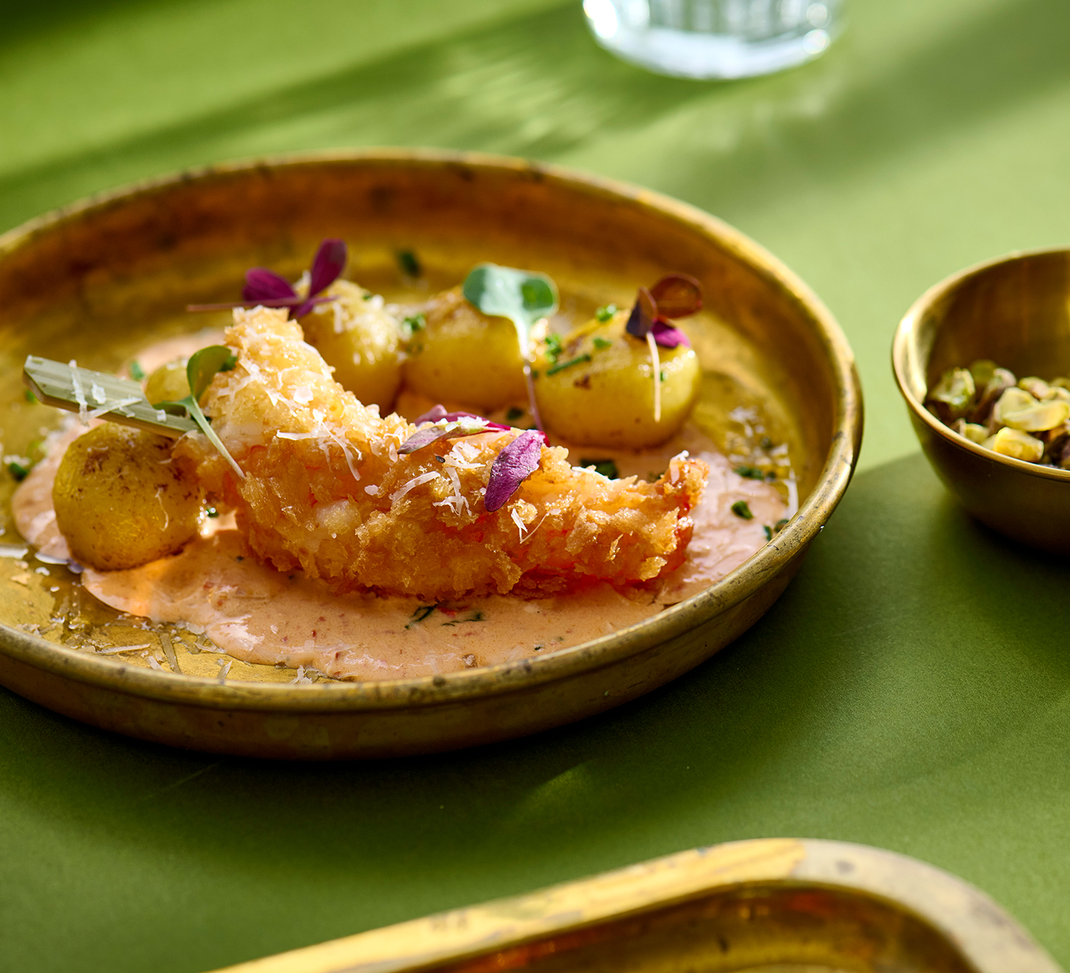 Szarvasgombával töltött gnocchi sült paprika mártásban panko morzsás garnélával